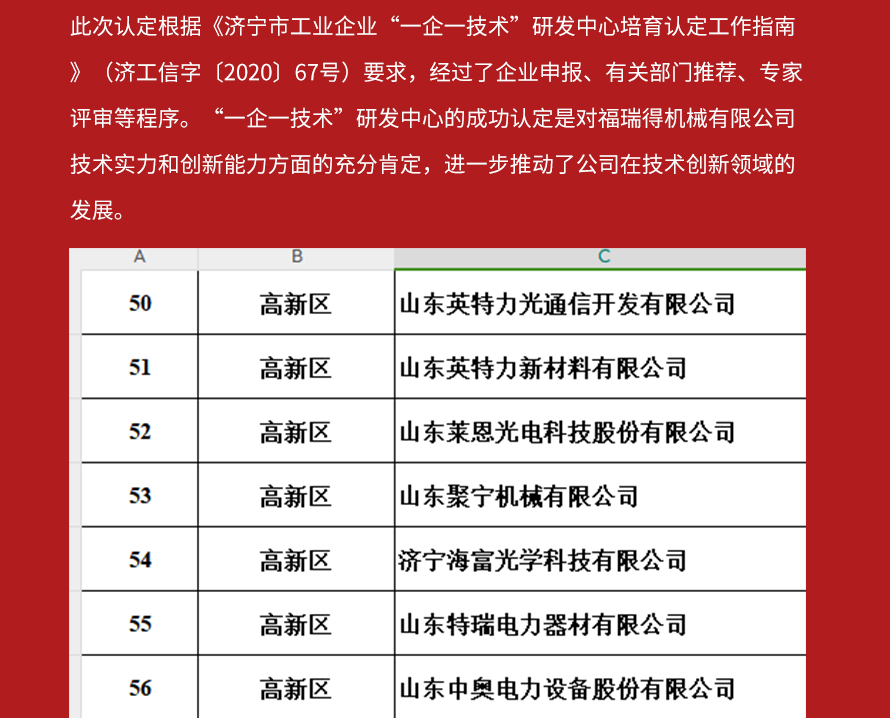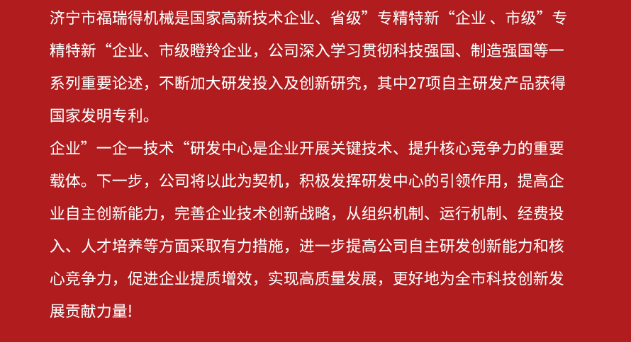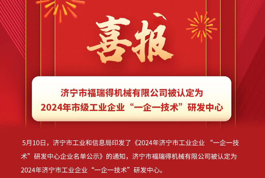 喜報!濟寧市福瑞得機械有限公司被認(rèn)定為市級工業(yè)企業(yè)“一企一技術(shù)”研發(fā)中心
