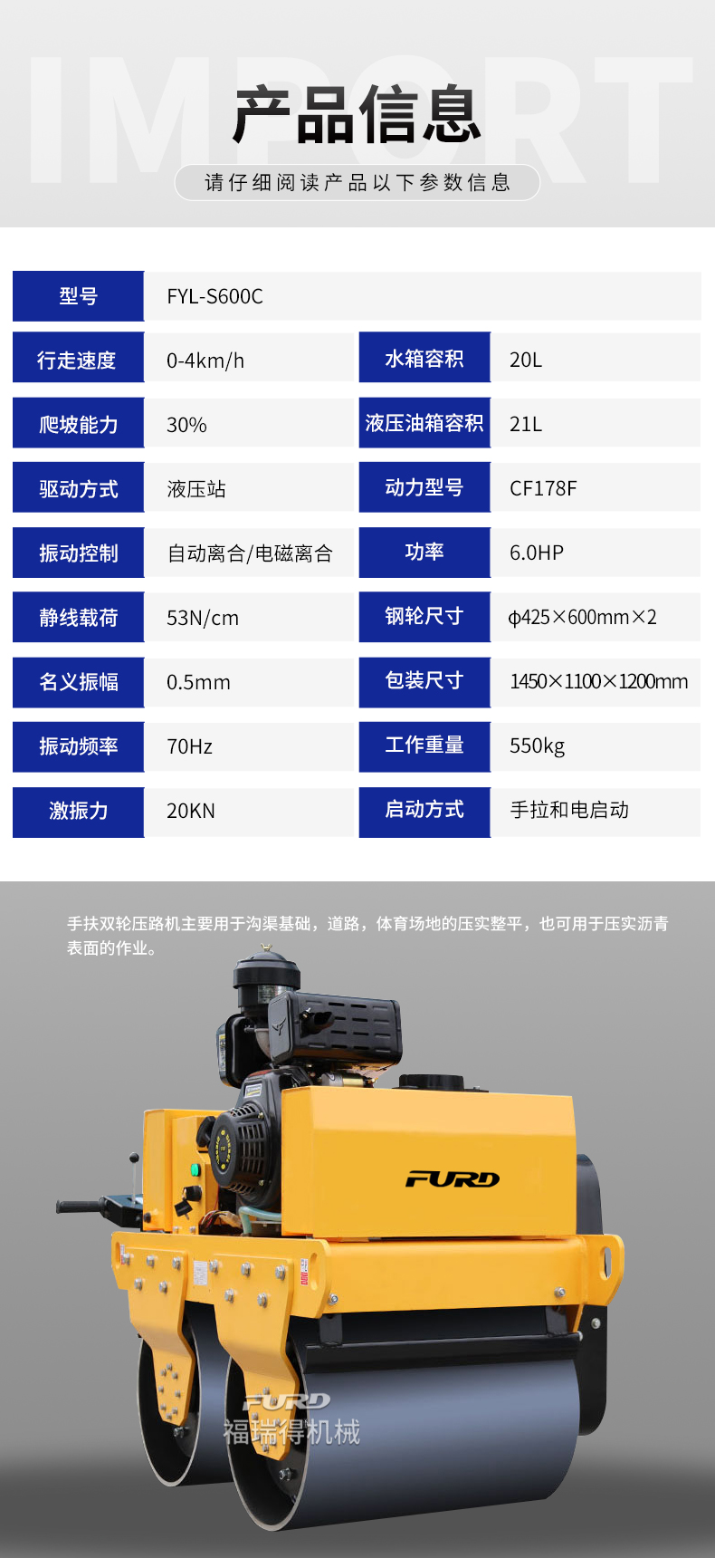 主要用于溝渠基礎(chǔ),道路,體育場地的壓實整平,也可用于壓實瀝青表面的作業(yè)。