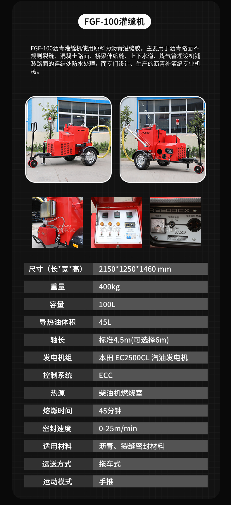 FGF-100瀝青灌縫機使用原料為瀝青灌縫膠,主要用于瀝青路面不規(guī)則裂縫、混凝土路面、橋梁伸縮縫、上下水道、煤氣管埋設(shè)機鋪裝路面的連結(jié)處防水處理,而專門設(shè)計、生產(chǎn)的瀝青補灌縫專業(yè)機械。