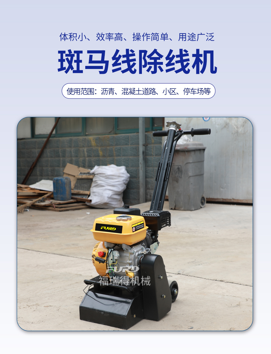 特點(diǎn):體積小、重量輕、機(jī)動(dòng)靈活、工作效率高、操作簡單。 適應(yīng)范圍:主要用于瀝青道路、混凝土道路、物業(yè)小區(qū)、機(jī)場、停車場等地的標(biāo)線清除。