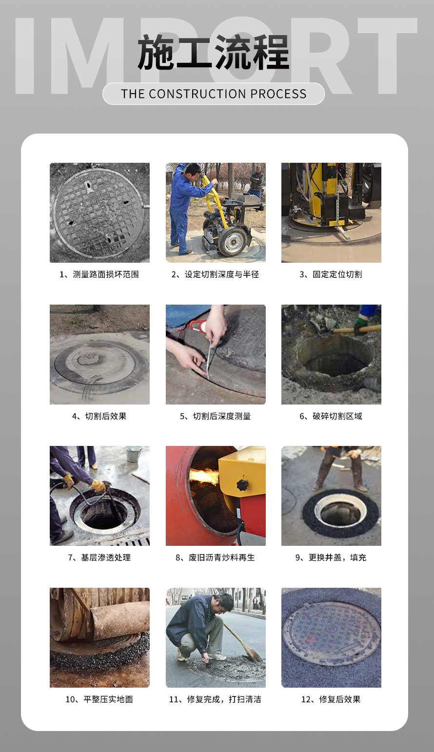 專門用于對城市道路中機動車道等井蓋周圍的水泥混凝土或瀝青路面進行圓形切割。為清楚井蓋周圍的破損路面提供分割區(qū)域,修復后的地面美觀,延長了路面的使用壽命。